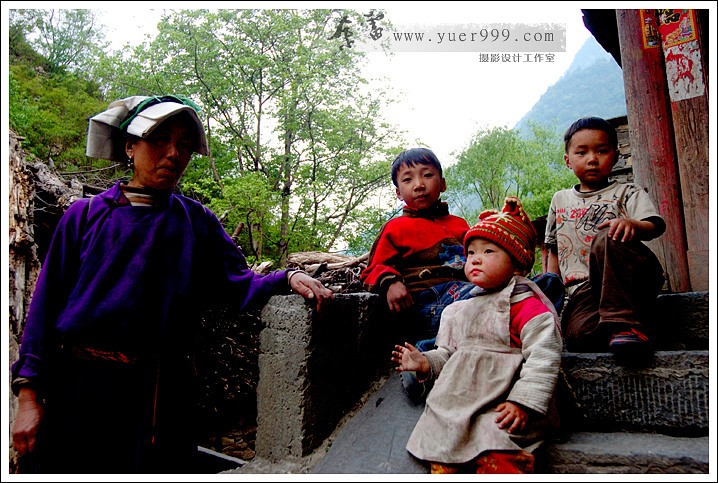 一位大娘与三个小孩在门前石阶上坐着,我们攀谈起来,从青蓝布衣、碉房上的图案经幡,最后聊到眼前的四门关古堡。