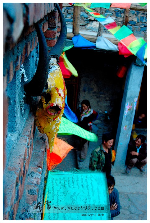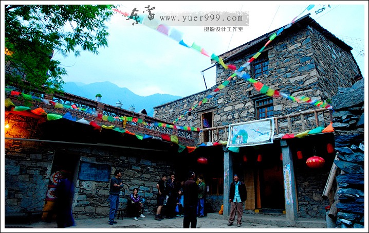 近傍晚时,到达上孟乡,上孟是藏语“什古”的音译,即“吉祥之地”,因地处孟屯河上游而得名。继续向日波寨前行一段,像做极限试车似的冲上一个山坡,便是我们原定的驻地——哈达驿站。五彩经幡在风中摇曳飘动,墙上隐约显现出的神秘图案令人浮想联翩,安挂于房缘上的黄色牛头更显圣洁、神秘,令人敬畏。这是嘉绒藏族民居的典型传统风格,全是用石头、原木筑就,整个驿站显得朴素灵动——它不是艺术品,但是却不动声色的打动每一位来往的行者。