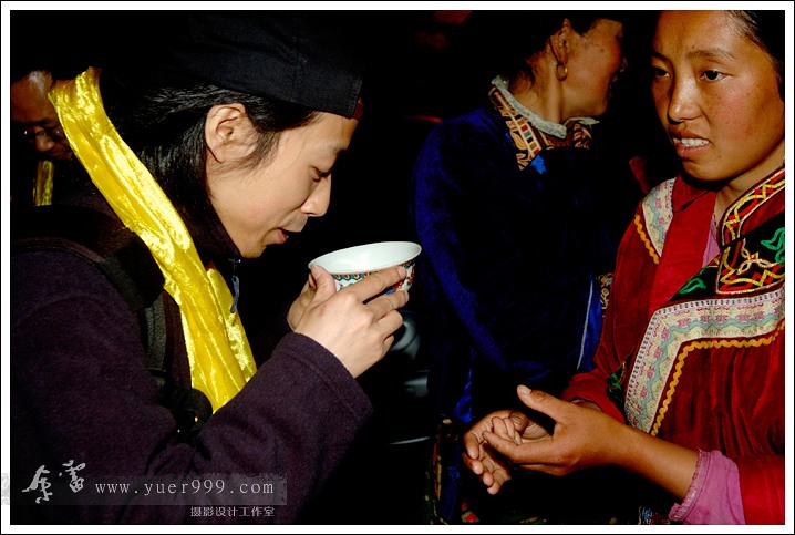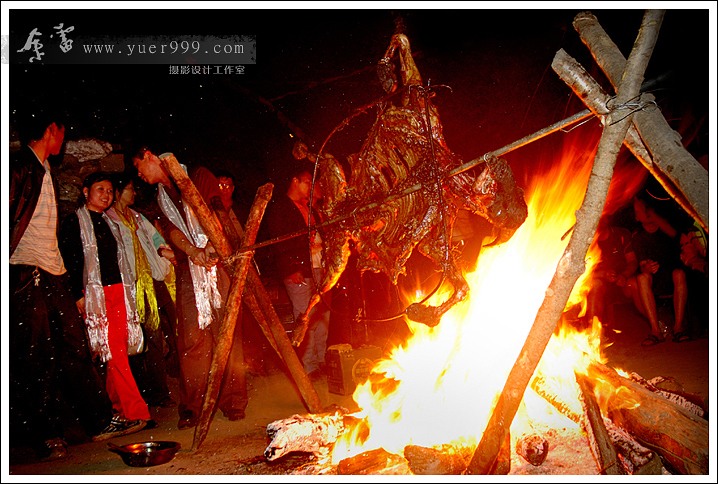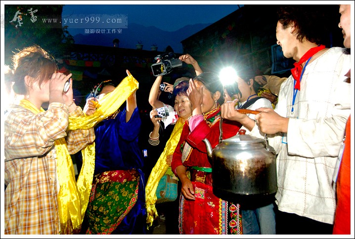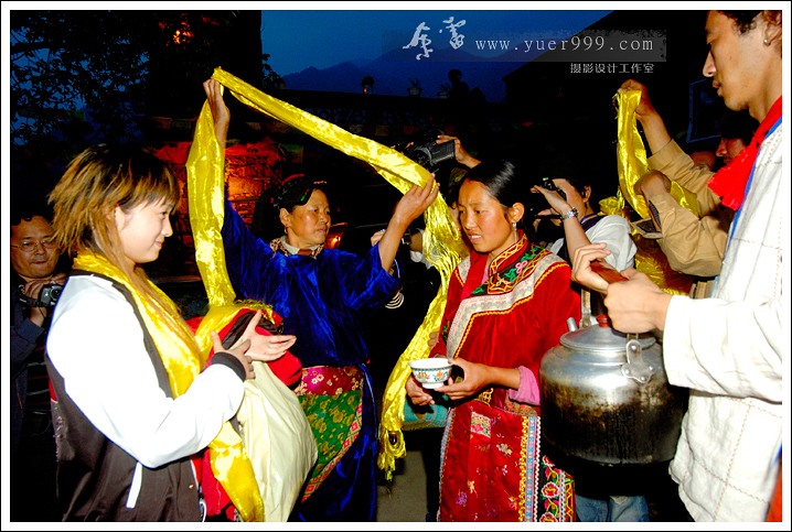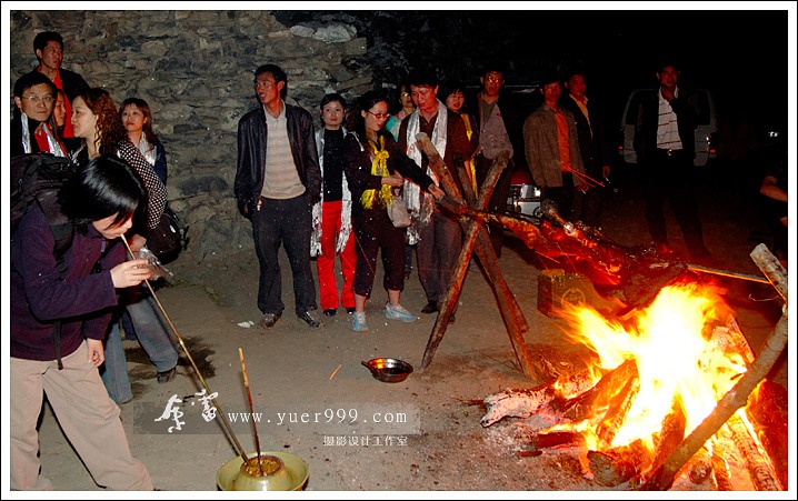 接过主人献上的哈达,喝下青稞酒。不知道什么时候,篝火已熊熊燃起。大家七手八脚的架起烤全羊的架子。在烤羊肉的醇香悠悠中,伴着火光,再也经不住锅庄舞曲的撩拨,大家漫舞起来……