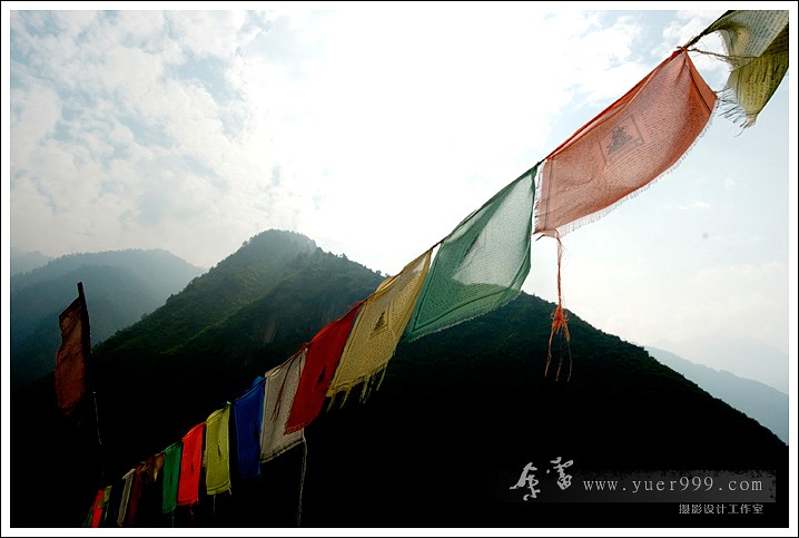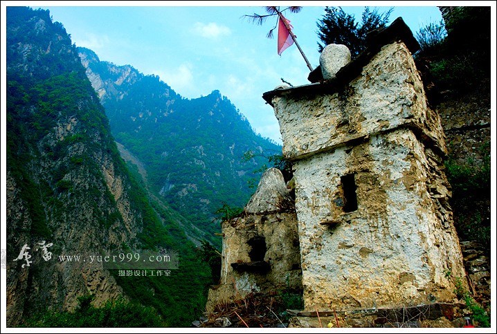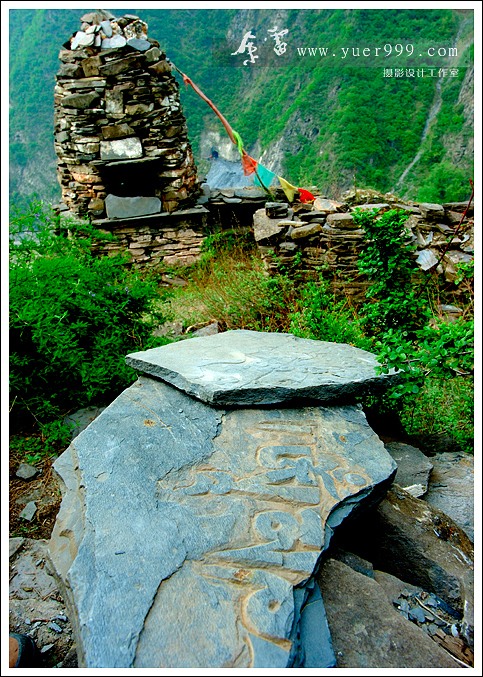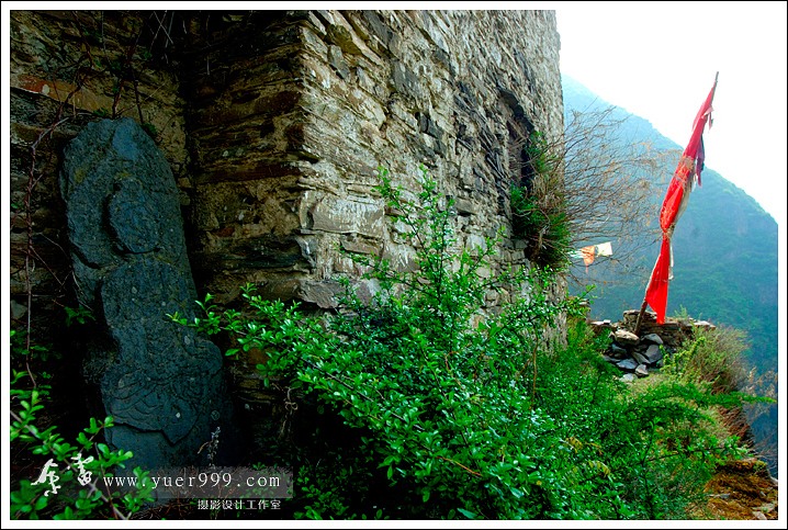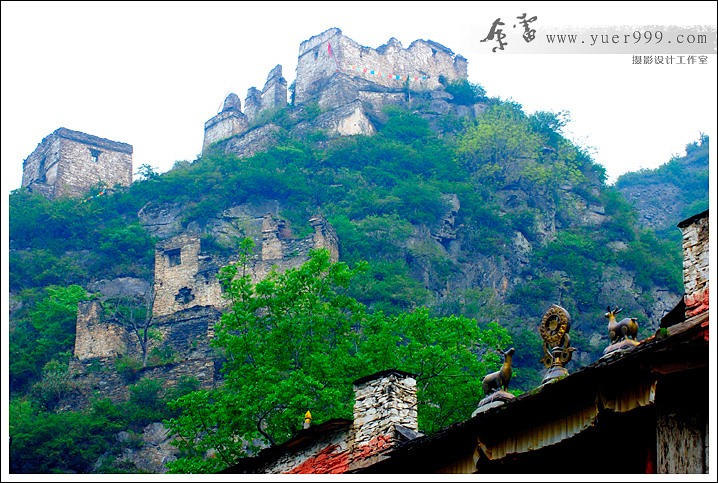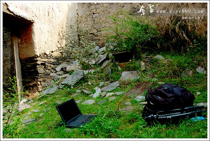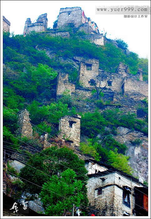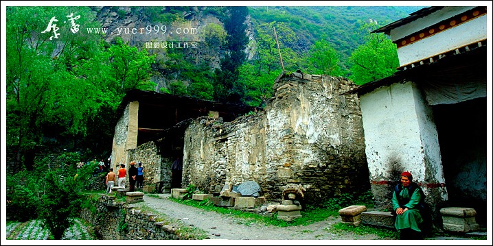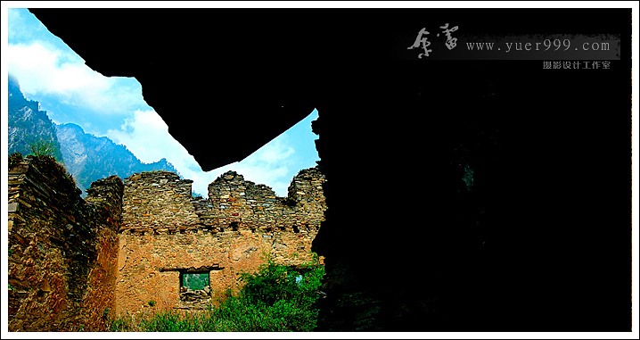 古堡矗立在山巅,是早被废弃的驿站,依然飘扬的五彩经幡却远远可见。我避开人群,独自向山颠攀爬。蜿蜒曲折的山路甚是险要,我不得不收起相机,扣好背包带,手脚并用,艰难的向上爬行。有些地段很窄很滑,旁边植物却生满尖刺,不敢去抓。“小心哟”一句童音在上面,抬头看见一小孩在望着我,我感激地笑笑,正替他担心,只见他如履平地,上下奔跳,转眼不见了踪影。 中部有一平台,我放下包稍作喘息。极目四望,大山之外还是大山,只是一层比一层来得更清薄更缥缈,下面的孟屯河像一条洁白的哈达,缠绕于山脚之间。此时阳光也变得好起来,几天来阴霾的天空开始微微显现出篮天白云的清新来,顿时精神一爽,又往上冲。 几近山顶,眼前一排颇为气派的石梯,尽管残破萧条,仰望上去,仍不难想象它昔日的辉煌。石梯顶端便是遗留的古堡,断垣残壁耸立,草木丛生——如此景象让人不由心生万千感慨。 我在山门前闭眼坐了一会。