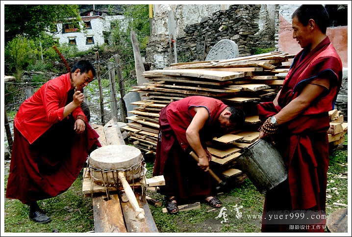 随即进入臧家寨子,远远的看见彩色藏装的女子带着小孩在自家房顶上晒太阳。这里碉房皆就地取材,用页岩、石块砌成,层层间糊以粘性较强的黄土,承重处加上木板支撑,显得敦厚朴实。简单的生活用具安安静静的享受着窗口透进的几丝阳光。房顶竖有经幡,建有熏烟(煨桑)塔,屋檐、门窗悬挂白色帘布帷幔,门楣、窗棱、房顶四角放置白石。碉房四面墙壁均用石灰涂边,窗户周围也勾白边,墙上画有图案。想必这些图案并非信手涂抹,定有其特殊的意义和作用。门前楼后堆着的都是劈成长块的木材,整齐地码成了围墙。