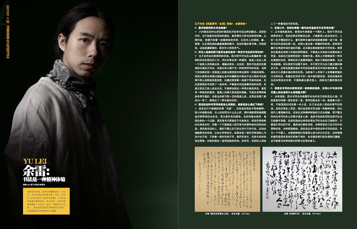 《凤凰周刊》:您现在书写的内容有没有一些特别的选择,在您心中书法对现代国人的生活有什么特别意义呢? 余雷:会有选择,因为书写的内容要符合当时自己的状态及心境。可能某段时间看一类东西多一些,那写的就会多一些。就像看小说一样,可能某段时间在看一本小说,自己也会进入类似的情节状态里。其实对很多人而言,我们应该把书写当做一种精神体验,所以现代人要接触书法,应该以这种精神体验的方式去接触, 而不要功利的去求写的多么好看价值多么高。虽然书法的实用性在现代社会已经微乎其微,但其实我身边有很多朋友平时也会自己练练字,不管他们写的好不好,最终他们都告诉我,非常享受自己在书写中的那种状态,非常舒服畅快。其实在生活中保有这种书写的状态,作为一个中国人,会联想到我们民族那么悠久的文化历史, 这种落根的感觉是很多其他东西换不来的,也会激发我们的自信和归属感,这可能是书法带给我们的更大的现实意义。
