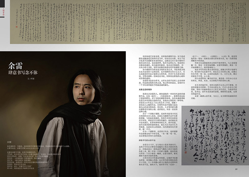 很多认识余雷的人,都知道他的一些具有代表性的摄影作品,比如《逐日》、《力量进化史》,故事的设定趋于原始和野性。对于年轻的摄影师来说,这些充满着神秘色彩且具有原始力量的作品,是他内心深处的一种呼唤。余雷在2009年成立了自己的艺术工作室,拍摄了多组动人心魄的作品。在那些作品中他极力表达着内心的真实和纯净,用自然、人文等因素勾勒出摄影者自身的心境。或者我们,本该一直坚持这种心境。 对于一个穿梭于摄影、绘画和书法等不同艺术类别的艺术人来说,余雷认为摄影作品中光影的把握,与绘画是相通的,传统艺术和时尚视觉并不冲突,两者还可以更好的融合。他的做法是不盲从流行,更多的体味传统艺术,放开思想,创作出更多新的独特视觉。他认为对艺术的探索,也是对心的探索。向内伸展和向外伸展,缺一不可。 作为一个摄影师,余雷游刃有余,他的摄影作品就像是他手中的毛笔,一张一驰一笔一划,见证着他在世间行走的痕迹。
